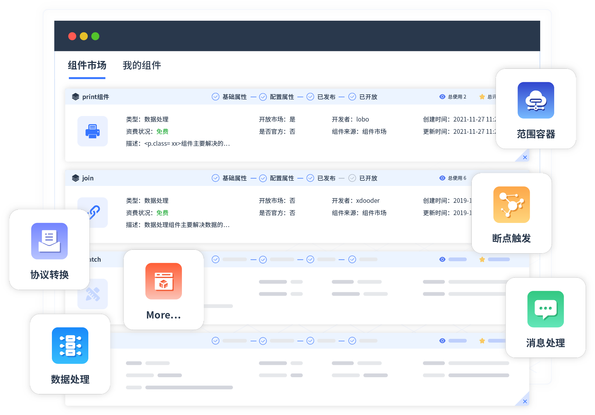 针对集成场景,e8体育提供组件市场,例如协议转换、消息处理、文件操作等。除平台提供的组件外,客户可以自定义所需组件。